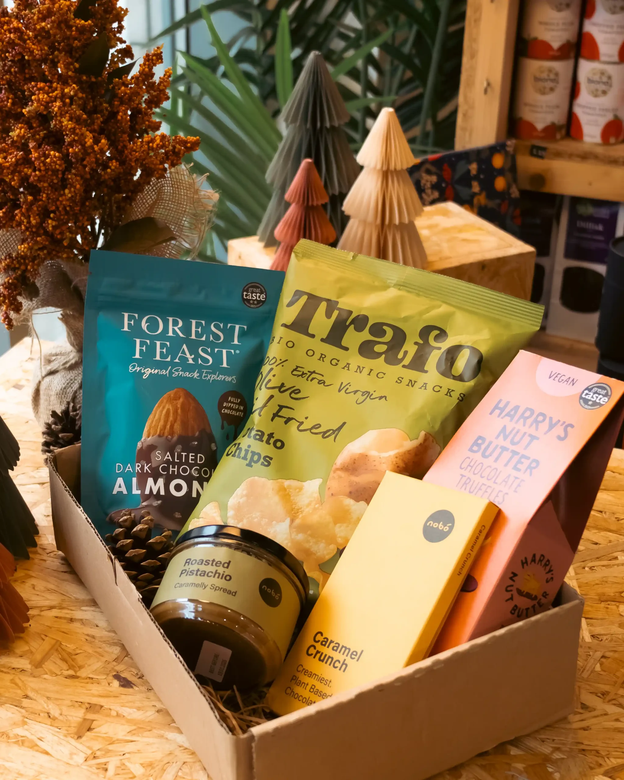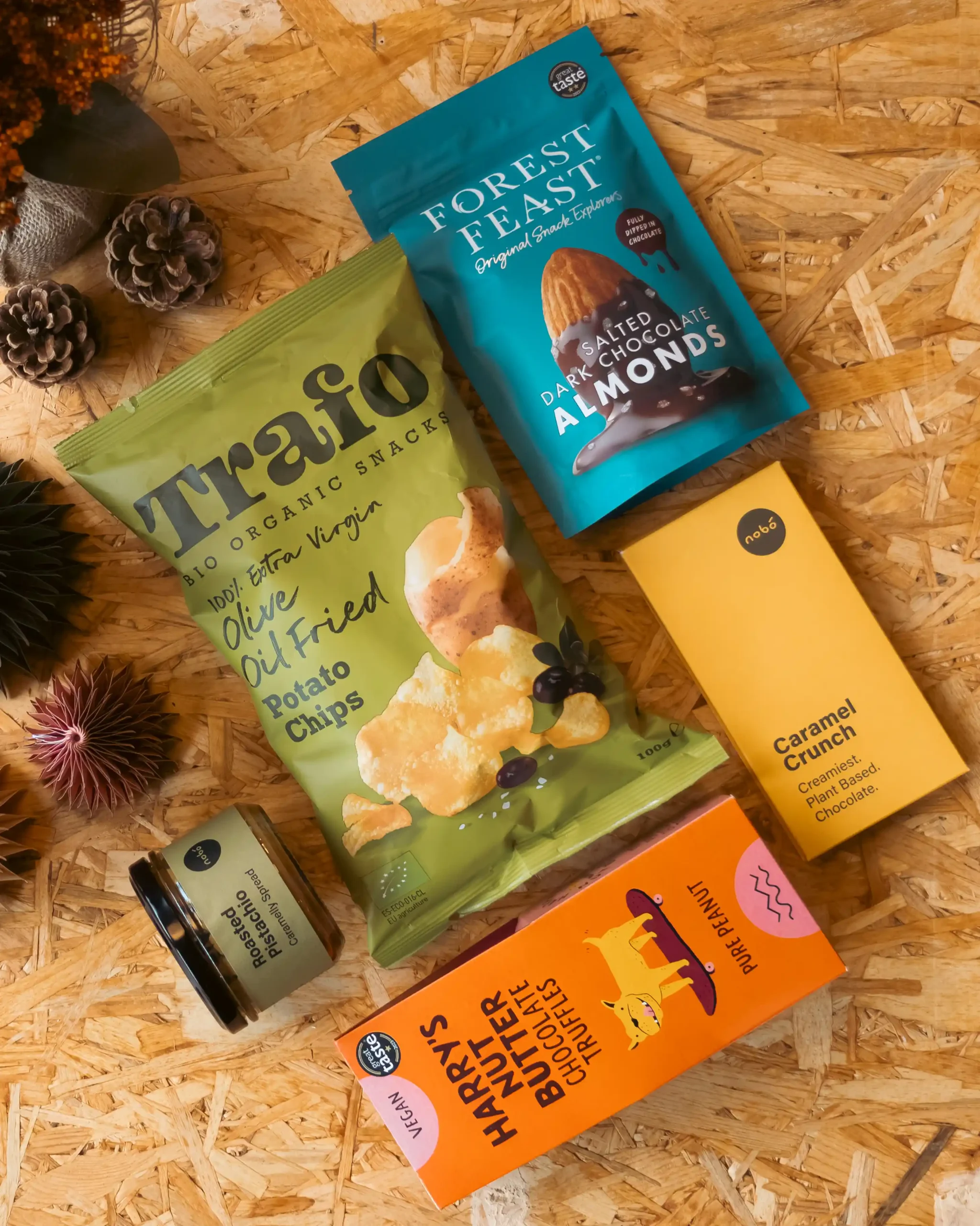 A delicious mix of nutritious treats including organic chocolate, roasted almonds, superfood snacks, and wholesome nibbles to keep you fuelled throughout the day.