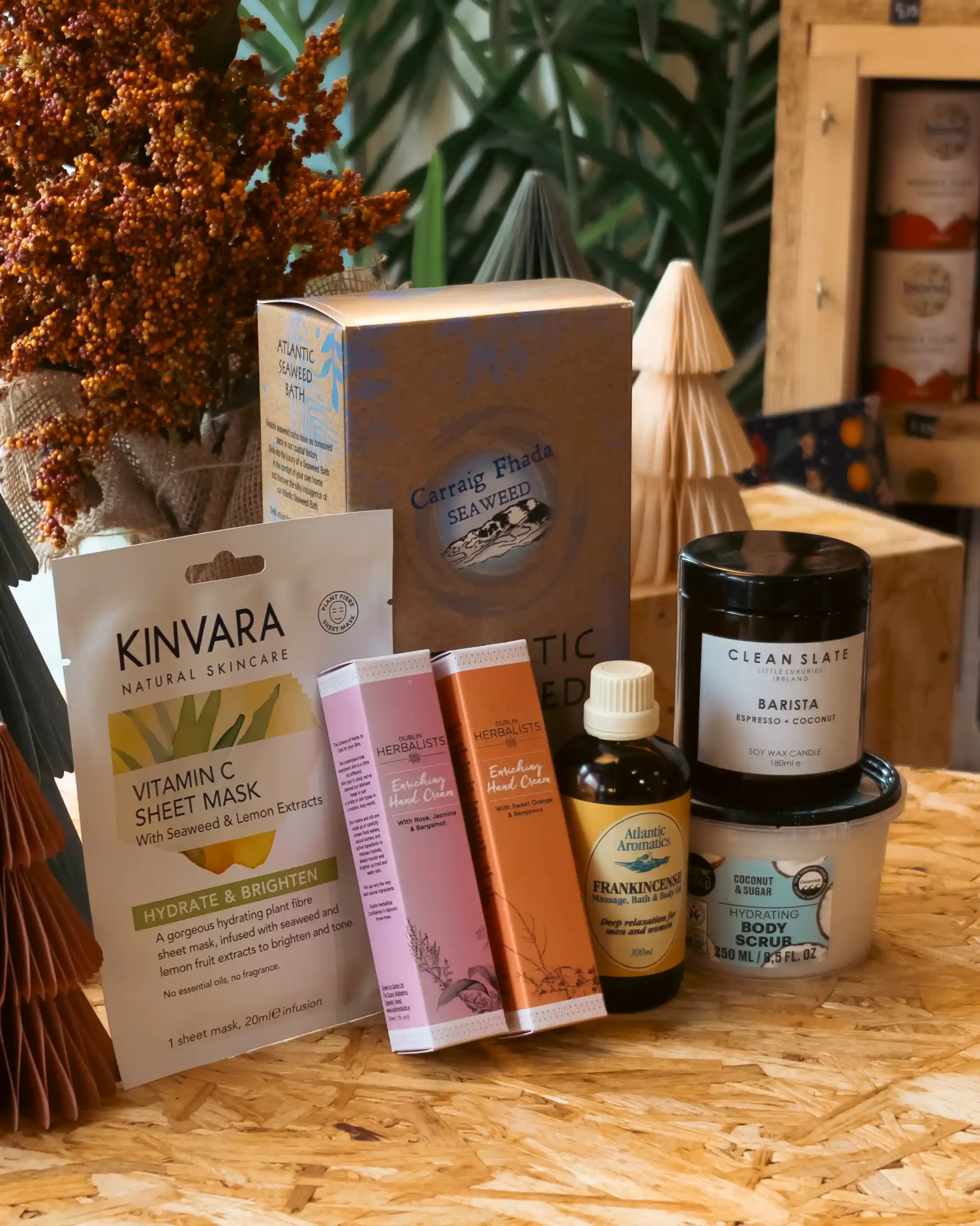 A luxurious pamper collection featuring bath salts, nourishing body oils, herbal teas, aromatherapy blends, and indulgent skincare for creating your perfect at-home spa experience.